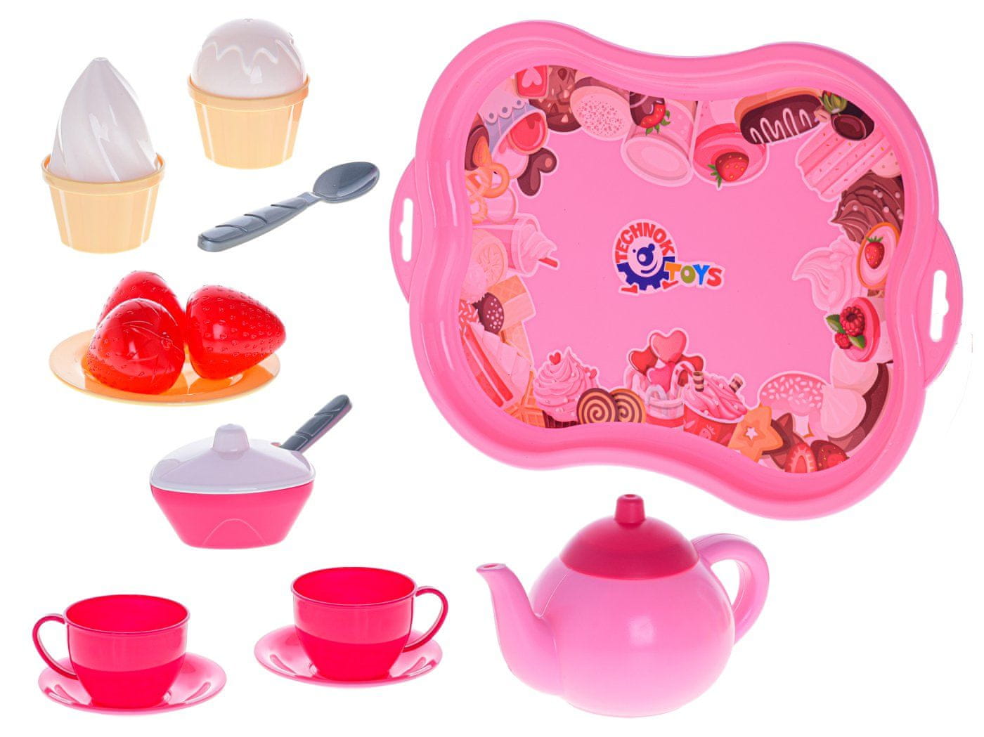 Tajni set je idealen za otroško igro doma in na prostem. Rožnato-rdeči set s sladicami, pladnjem in sadjem bo navdušil vsako malo gospodinjo. Primeren je za otroke od 3. leta starosti dalje.