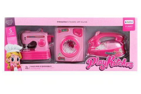 Set gospodinjskih aparatov na baterijski pogon. Vsak se napaja z 2×AA baterijami (niso vključene). Material plastika. Železo se sveti, proizvaja zvoke in v njem letijo kroglice. Pralni stroj se vrti in proizvaja zvoke. Šivalni stroj posnema gibe pravega šivalnega stroja. Pakirano v škatli. Dimenzije paketa so približno 39*x16×8 cm. Starost 3+
