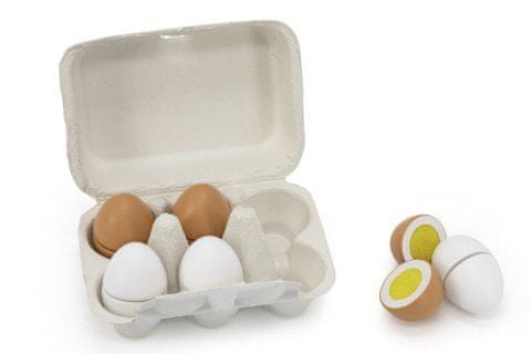 Drevesna jajca v papirnati škatli. Paket vsebuje 6 jajc. Vsako jajce je prerezano na pol in povezano z velcro. Dimenzije 15×10,5×7 cm. Starost 3+