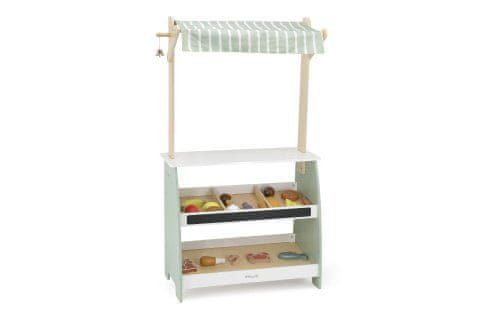 Lesena trgovina z živili. Vsebuje trgovino in 18 živil. Dimenzije paketa so približno 64×39×10 cm. Dimenzije zložene trgovine 104×57,5×30 cm. Starost 3+