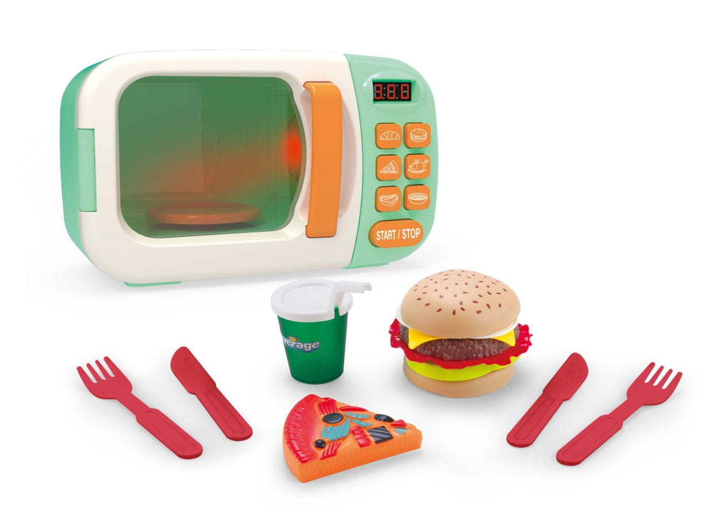Mikrovalovna pečica z učinki. Velikost 23×10×15 cm. Vključene baterije 3×AA. Vključuje mikrovalovno pečico, hamburger, rezino pice, jedilni pribor in pijačo. Ustvarja zvočne in svetlobne učinke.