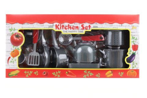 Set kuhinjske posode vključuje kuhalnik, lonec s cedilom, pekač, ponev, ponev, pokrovko, zajemalko, obračalnik in 2 zajemalki za testenine. Material plastika. Pakirano v škatli. Dimenzije paketa približno 46×22×10 cm. Starost 3+