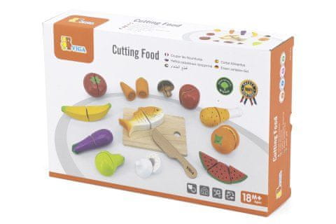 Leseni set za rezanje hrane vključuje desko za rezanje, nož, ribo, paradižnik, korenček, gobe, banano, jajčevec, hruško, česen, melono, pomarančo, piščančje stegno, poper. Velikost paketa je približno 30,5 × 20,5 × 7 cm. Starost od 18 let dalje