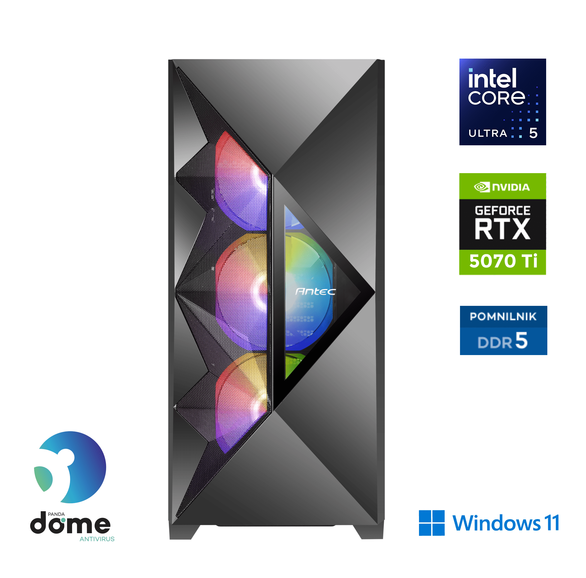 Poganja ga zmogljiv procesor Intel Core Ultra 5–245KF. Vrhunsko grafično in igralno izkušnjo zagotavlja samostojna grafična kartica Nvidia GeForce RTX 5070 Ti s 16 GB grafičnega pomnilnika.
