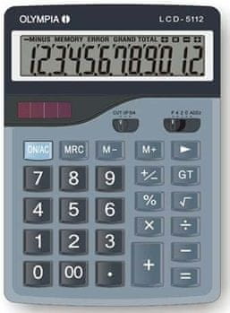 Namizni kalkulator Olympia LCD-6112 z velikim 12-mestnim LCD zaslonom vam ponuja možnost enostavnega in hitrega preračunavanja z uporabo številnih računskih operacij in vgrajenih funkcij. Na voljo so vam: seštevanje, odštevanje, deljenje, množenje, sprememba predznaka, računanje procentov, davka, korena in marže, pretvorba valute, funkcija Grand Total, izbris Total, možnost popravka, izbira decimalnega mesta, tipka 00, zaokroževanje in izbris zadnje vrednosti. Poskrbljeno je tudi za samodejen izklop in funkcijo spomina. Napaja se kombinirano, in sicer prek sončnih celic in baterije.