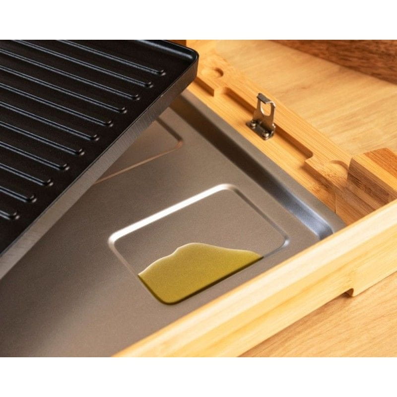 Okvir je izdelan iz trpežnega bambusa, ki predstavlja estetsko, naravno in ekološko rešitev. Okvir se med kuho ne segreje in se ga lahko varno dotikate brez nevarnosti opeklin. Hkrati omogoča, da žar enostavno prenesete iz pulta na mizo. Žar ima vgrajene tudi dodatne ročaje za varnejše rokovanje. Naprava je zasnovana za kuho neposredno na jedilni mizi. Pričarajte pravo kulinarično doživetje!