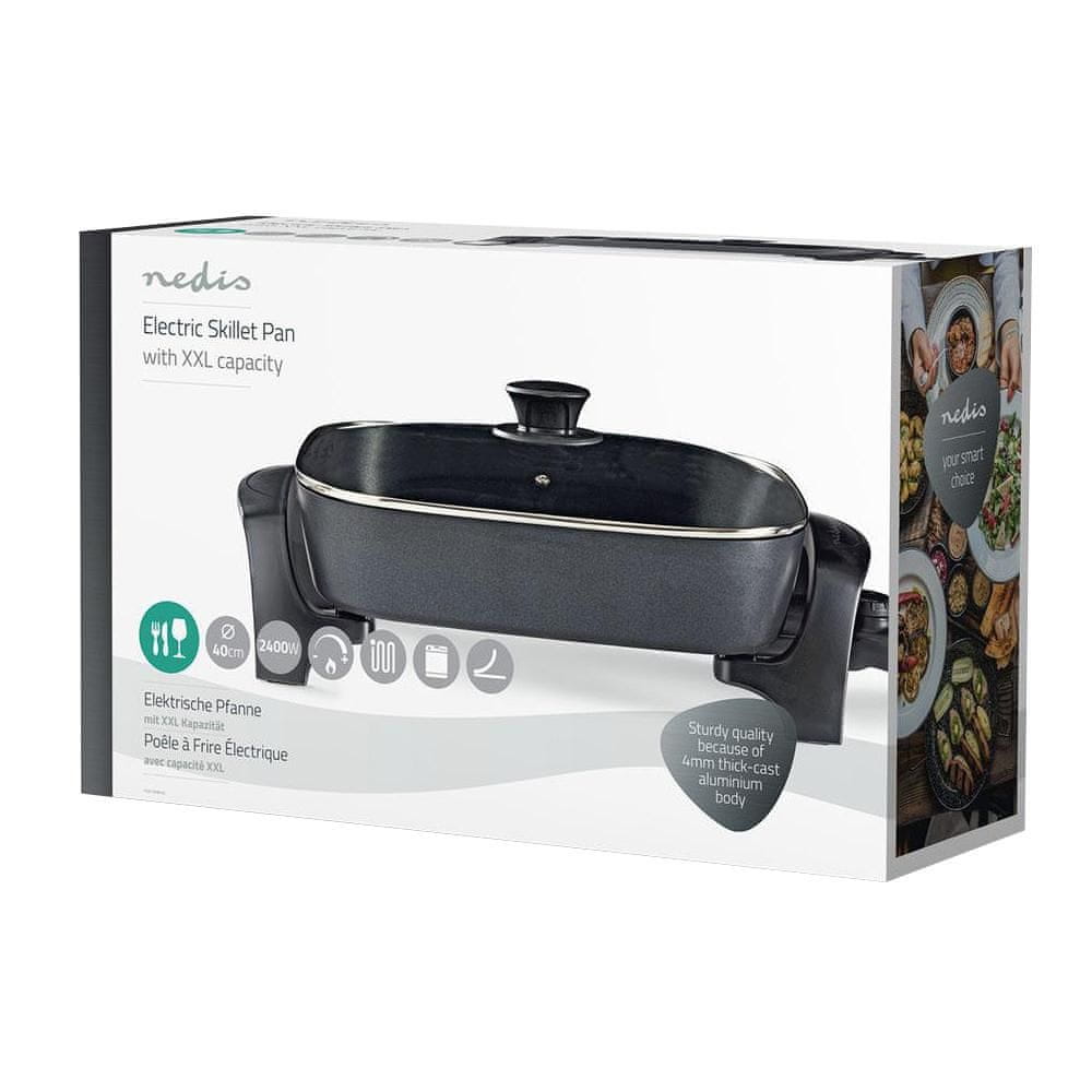 Ta električna ponev je eden najbolj vsestranskih kuhinjskih dodatkov, ki jih lahko imate v kuhinji. Z veliko prostornino in nastavljivim termostatom lahko do popolnosti skuhate tako majhne kot velike jedi. Debelo ohišje iz litega aluminija z litim grelnim elementom omogoča izjemno porazdelitev toplote po kuhalni plošči. Zahvaljujoč pokrovu iz kaljenega stekla ter toplotnoizolacijskim gumbom in ročajem je ponev enostavno varno premikati z enega mesta na drugega tudi takoj po uporabi. S premazom proti prijemanju je tudi pranje hitro in enostavno!