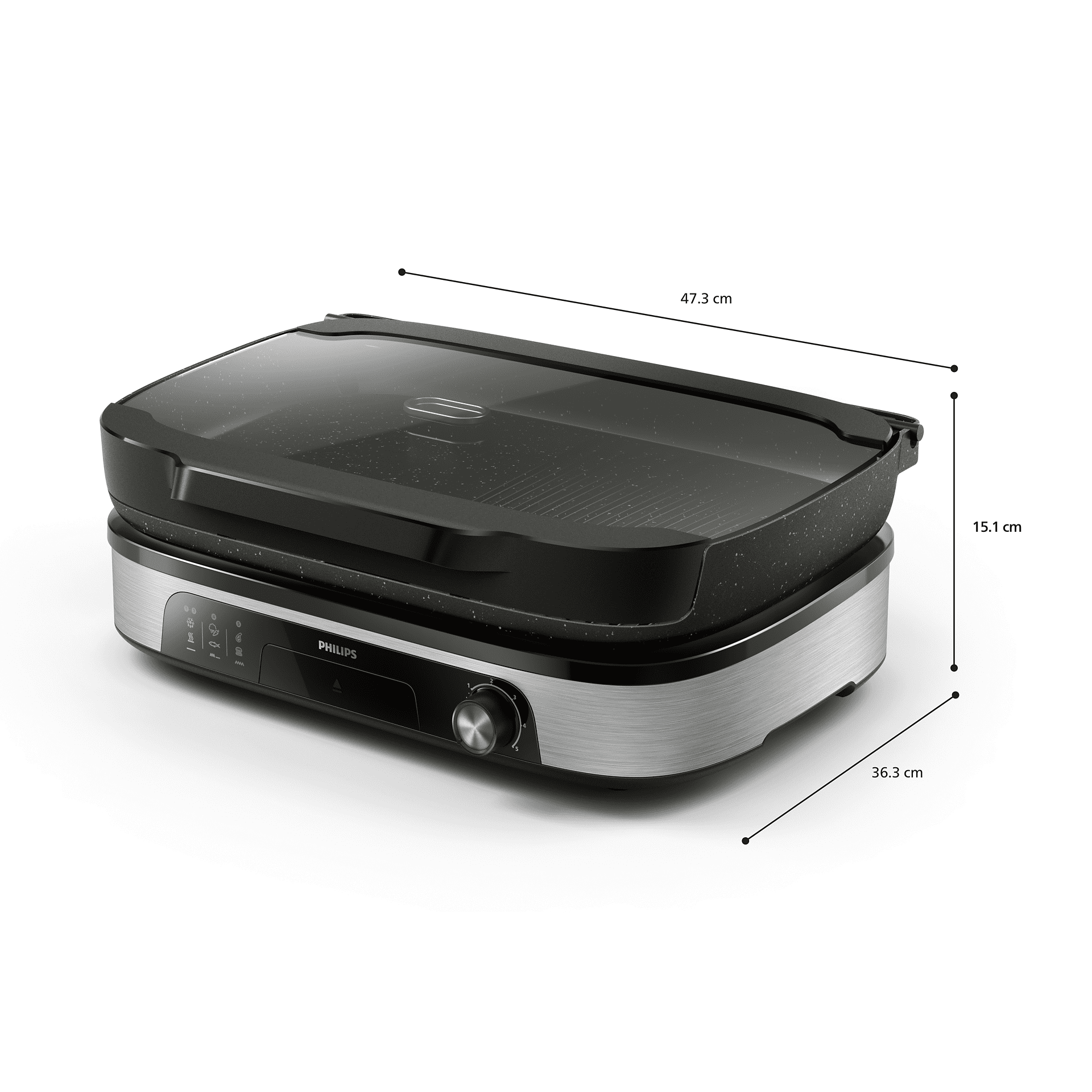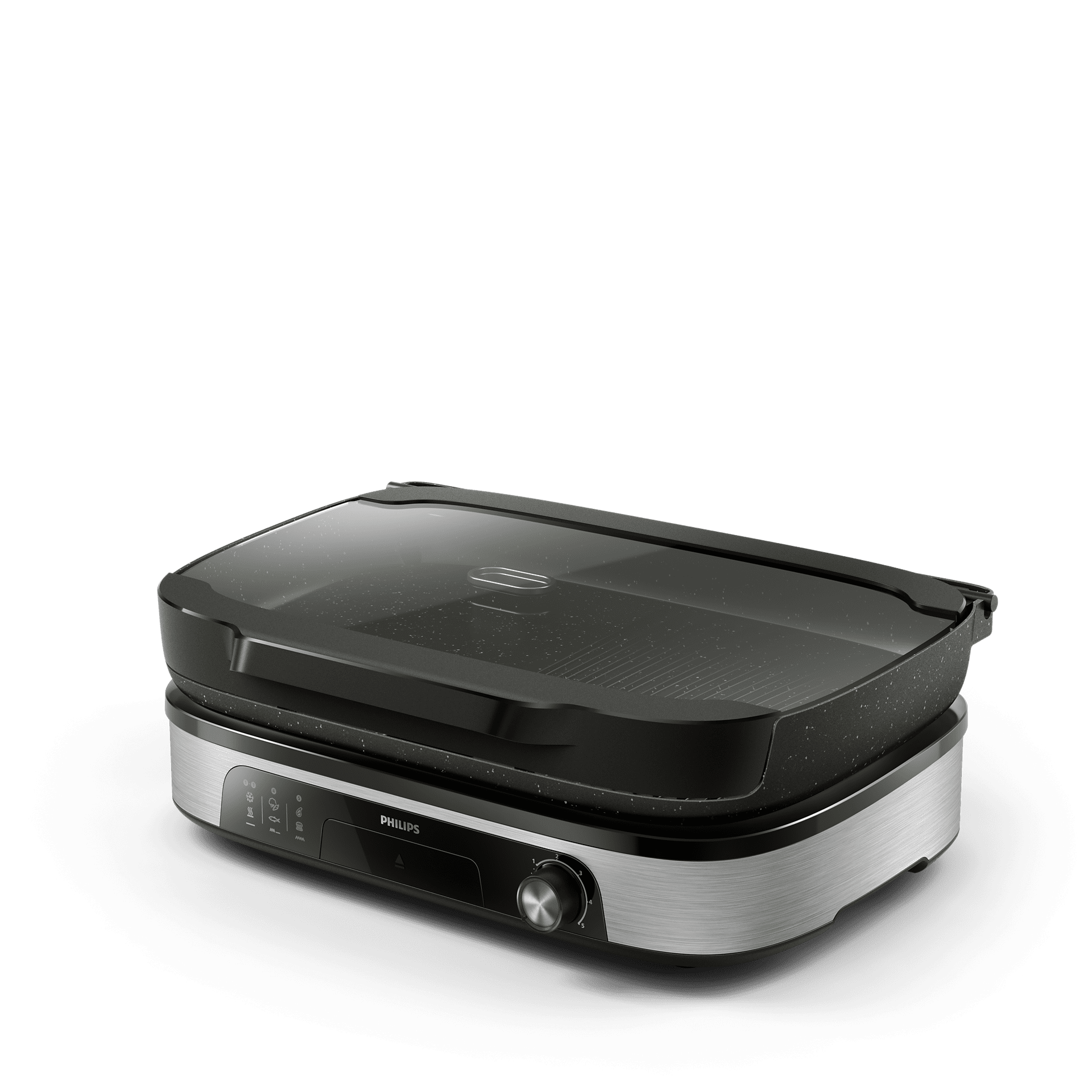 Rebrasto stran plošče uporabite za peko mesa in rib, ploska stran pa je idealna za jajca, slanino, zelenjavo in druge jedi. Stekleni pokrov ohranja okuse ter poskrbi za sočne jedi z žara in čistejšo kuhinjsko površino. Dodajte trske in zaprite pokrov, da meso in ribe dobijo pristni dimljeni okus žara. Difuzor za aromo pa dodatno obogati okus hrane z naravnimi notami zelišč ali celo vina.