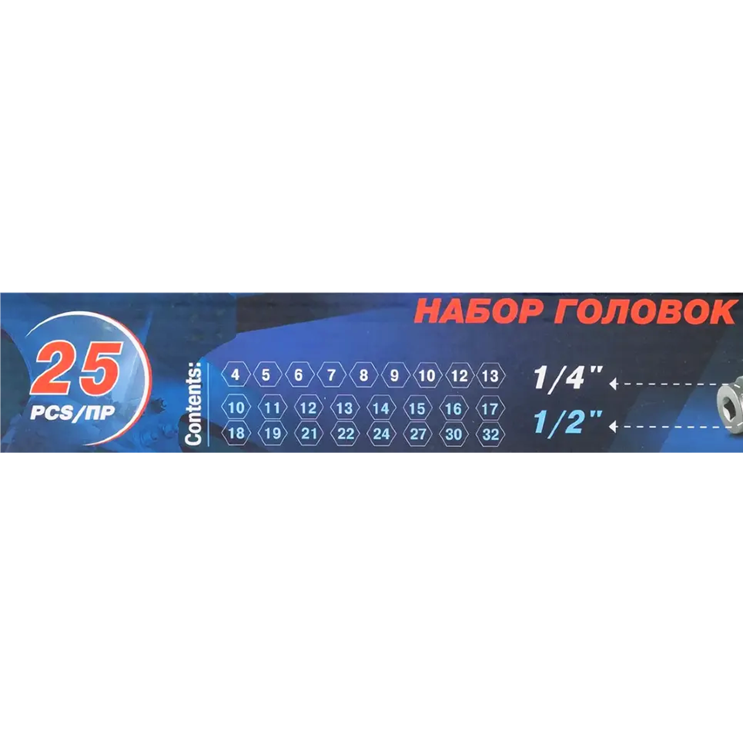 Velikosti nastavkov v kompletu: 1/2" nastavek: 10, 11, 12, 13, 14, 15, 16, 17, 18, 19, 21, 22, 24, 27, 30, 32 mm