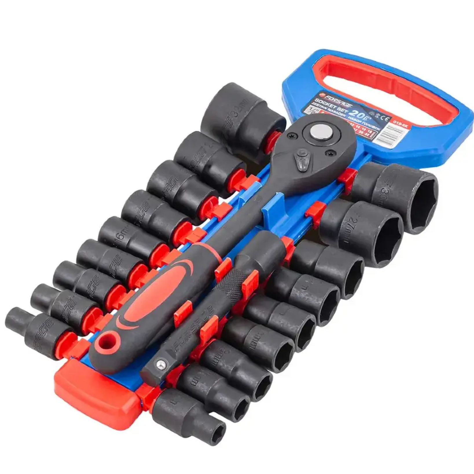 Celoten 20-delni komplet je nepogrešljiva oprema za vsako delavnico, avtoservis ali domačo garažo. Zahvaljujoč široki izbiri velikosti nastavkov in trdni izdelavi komplet omogoča udobno in varno delo pri številnih mehanskih in avtomobilskih aplikacijah.