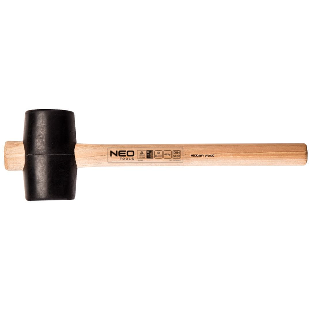 Gumijasto kladivo NEO (ref. št. 25–052) tehta 425 g in ima premer glave 65 mm. Uporablja se predvsem v gradbeništvu, zaključni obdelavi, montaži in obdelavi pločevine, saj guma ne poškoduje krhkih materialov. Ročaj je izdelan iz trpežnega hikorijevega lesa. Gumijasta glava je pritrjena s klinom na stožčastem ročaju, kar zagotavlja varnost med uporabo. Certifikat TÜV Rheinland zagotavlja visoko kakovost in zanesljivost izdelka. Blagovna znamka NEO izpolnjuje pričakovanja strokovnjakov.