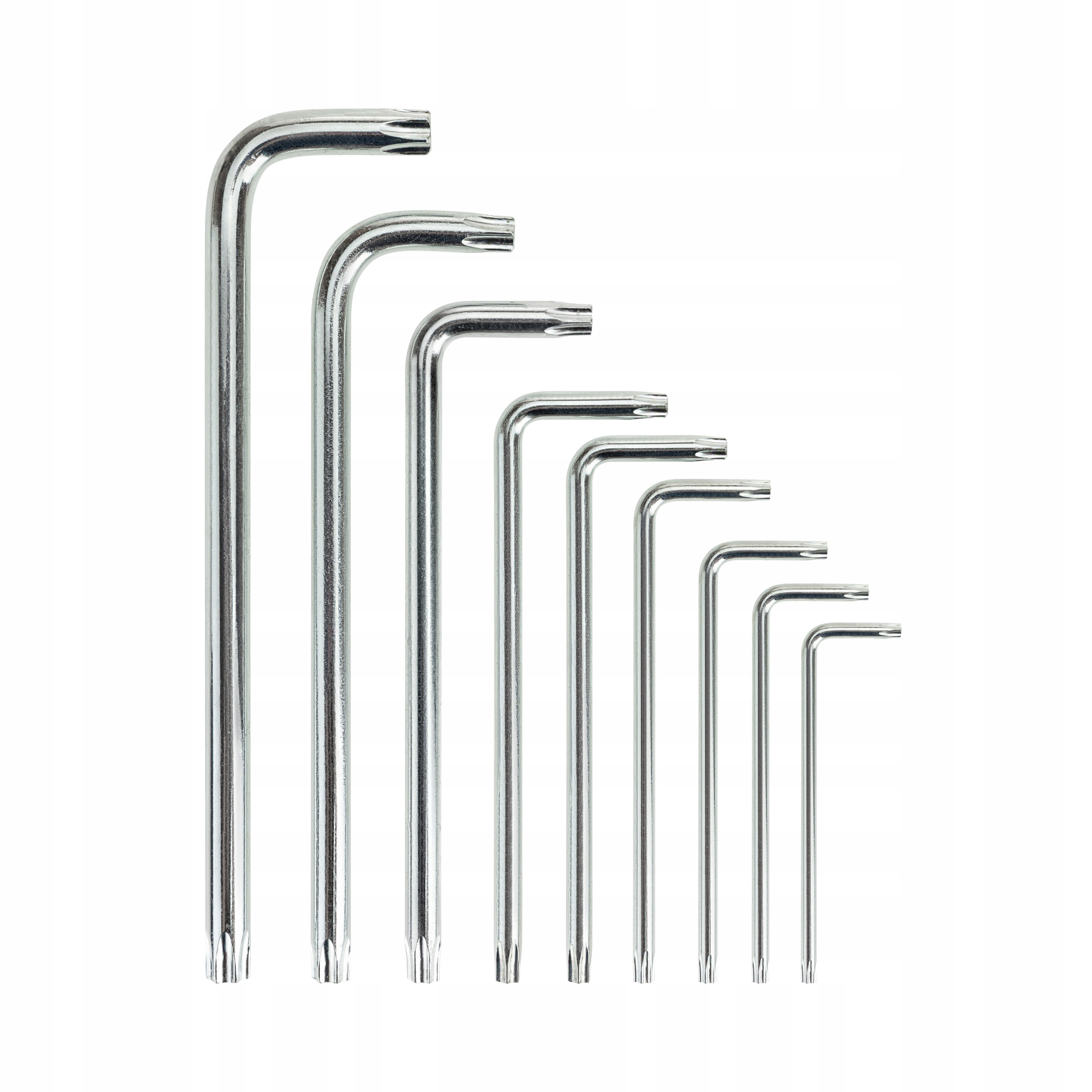 Komplet vsebuje 9 ključev v velikostih od T10 do T50. Ključi so izdelani iz visokokakovostnega krom vanadijevega jekla – zaradi česar so zelo trpežni, odporni na mehanske poškodbe in upogibanje. Pakirano v priročnem plastičnem držalu z ustreznimi mesti za vsak ključ. To vam omogoča, da vzdržujete red in nadzorujete število ključev. Poleg tega ima ročaj luknjo, , ki vam omogoča, da ga obesite na priročno mesto.