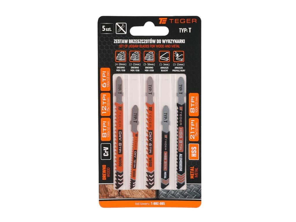 Komplet listov za vbodno žago – Tip: T – KOVINA/LES / TEGER je priljubljeno orodje, zasnovano za vbodne žage, idealno za hitro rezanje lesa in materialov, kot so mehki les (2–15, 4–50 mm), trdi les, vezan les, MDF in OSB plošče, GPR plastika – ojačana s steklenimi vlakni, cevi, profili, pločevine, pločevina (1–3, 3–15mm), zaprti profili in kovinske cevi (