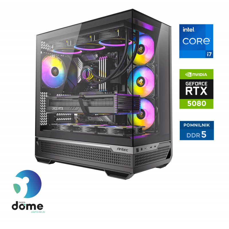 Poganja ga 20-jedrni procesor Intel® Core™ i7–14700KF z vodnim hlajenjem, samostojna grafična kartica Nvidia GeForce RTX 5080 pa bo poskrbela za brezhibno grafično upodabljanje.