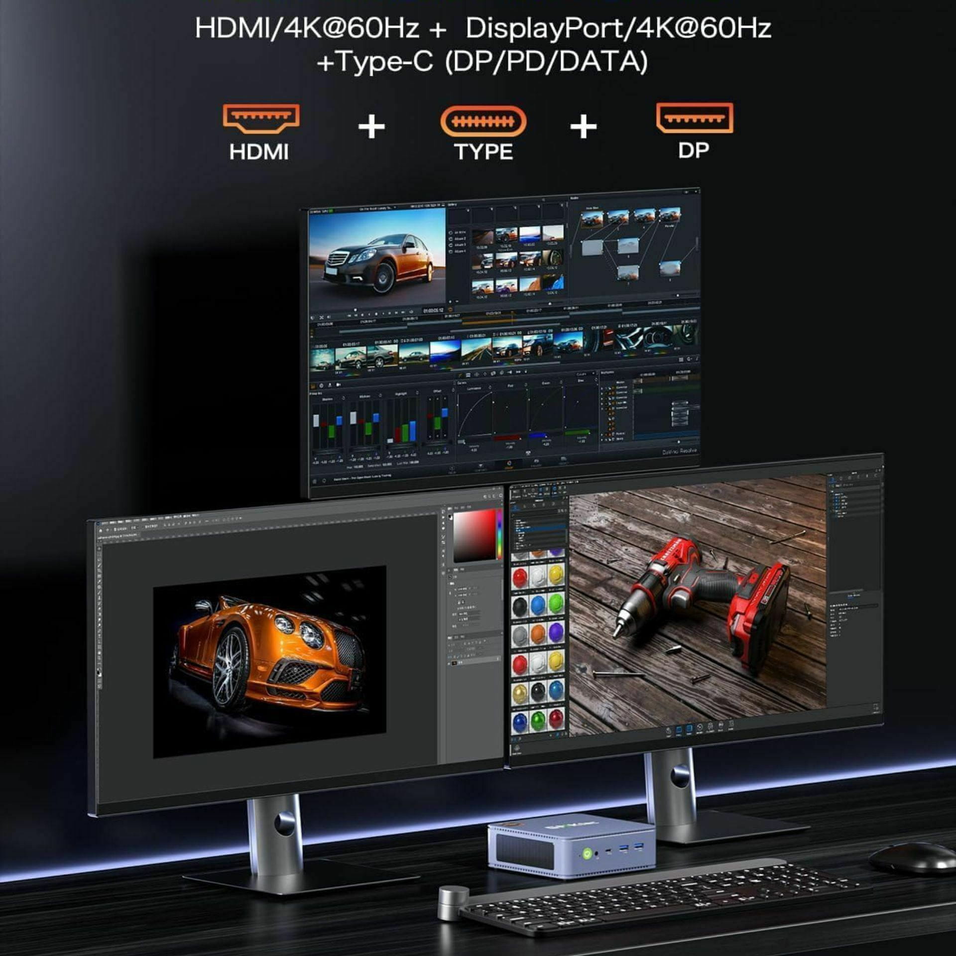 Majhen, a zmogljiv: V primerjavi z običajnimi namiznimi računalniki meri mini računalnik GMKtec M5 Plus samo 128 × 127 × 52mm. S svojo vsestransko zasnovo priklopov (2 x USB 3.2 Gen1, 2 x USB 2.0, 1 x DisplayPort, 1 x HDMI, 1 x Type-C (podpora za DP/DATA), 1 x avdio vrata in 2 × 2,5 G Gigabit LAN), mini računalnik podpira Windows 11 Pro, sočasen izhod na treh zaslonih in zagotavlja izjemno realistično izkušnjo 4K za največjo produktivnost
