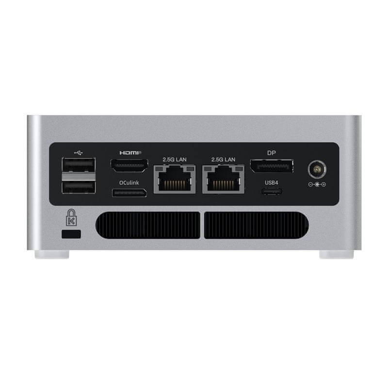 Na zadnji strani ohišja je vhod USB4, ki podpira napajanje PD (65–100 W), prenos podatkov s hitrostjo do 40 Gb/s ter video izhod. Na voljo sta tudi dva priključka USB 3.2 Gen2, dva USB 2.0, HDMI 2.0, DisplayPort 1.4, OCulink, 3,5-milimetrski kombinirani priključek in 2 priključka RJ45 2,5G Ethernet. To je bogat nabor priključkov, ki omogoča priključitev praktično vseh perifernih naprav, monitorja ali dodatne opreme – brez uporabe dodatnih adapterjev.
