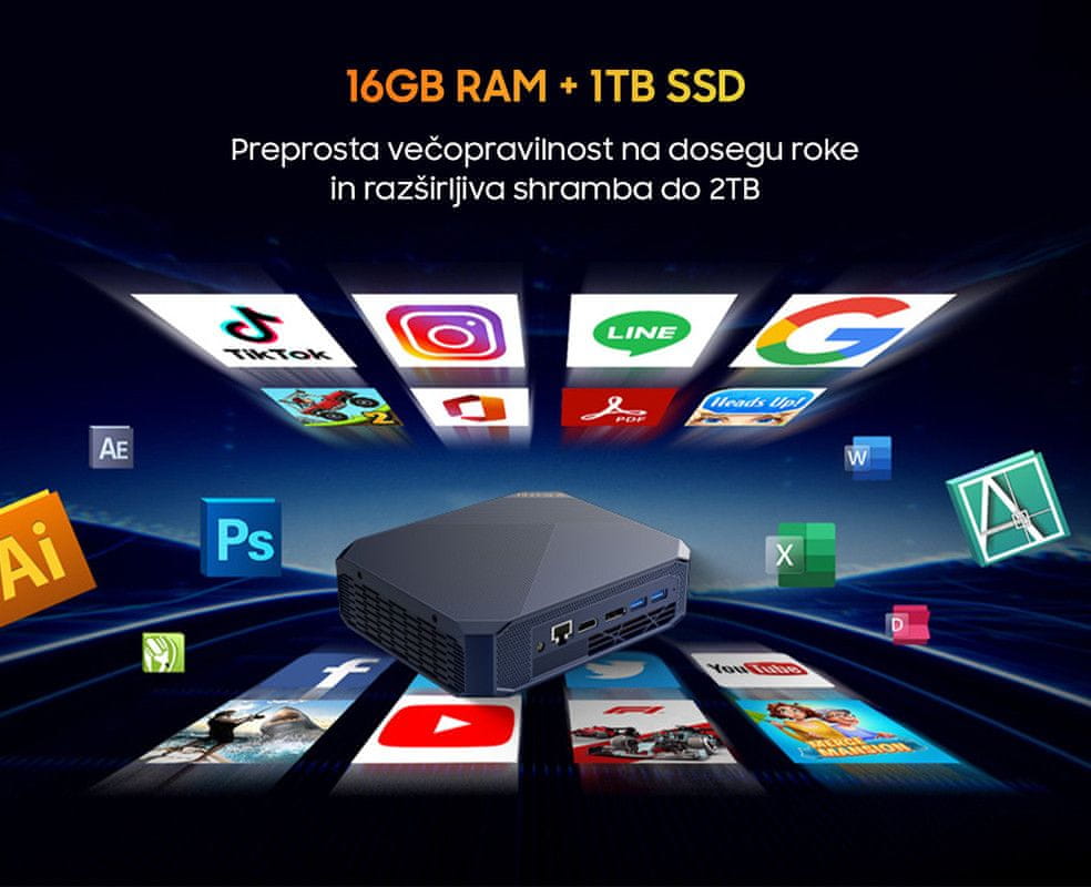 - Lastnosti in funkcije: prednaložen Windows 11 Pro operacijski sistem, 16GB RAM prostora + 512GB SSD disk, priklop do 3 zaslonov, dvopasovna WiFi 6 povezava, Bluetooth 5.2 povezava, razširljiv spomin do 2TB, učinkovito odvajanje toplote, tiho delovanje, ultra lahka teža, univerzalna združljivost, priloženo stojalo / nosilec,…