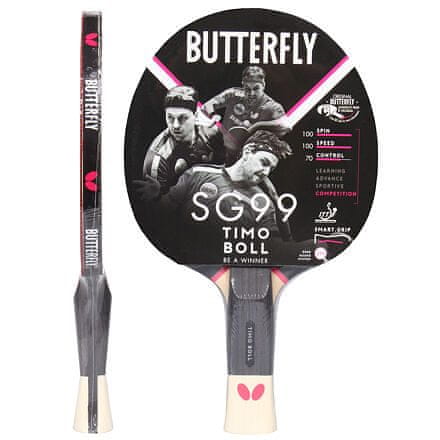 Palice za namizni tenis Timo Boll SG (Smart Grip) vodilnega proizvajalca Butterfly so poimenovane po enem najboljših igralcev namiznega tenisa vseh časov. Lopar za pingpong Timo Boll SG99 je namenjen vrhunskim igralcem, ki že dosegajo visoko raven igre, vendar želijo svoje igralne sposobnosti še bolj razviti po izjemnih sposobnostih prvaka Bolla in želijo izstopati tako kot on, tako s preobiljem tehnično odigranih žogic kot z dinamičnimi napadalnimi udarci. Poleg izpopolnjene tehnične ravni udarcev s spinom in izjemne hitrosti gibanja z bliskovitimi refleksi pri sprejemanju nasprotnikovih žogic boste seveda potrebovali tudi ustrezno zmogljivo palico. Timo Boll SG99 ima 1,8-milimetrski pokrov Wabaka za večji potencial udarcev z višjim spinom z anatomsko oblikovanim ročajem s sredinsko zarezo za bolj odziven in polnejši oprijem palice ter za zmanjšanje nevarnosti zdrsa prstov. Tehnološka posebnost je tudi sistem EGS (Edge Guard System), spremenjen rob pokrova palice, ki zmanjša izgubo energije udarjene žogice ob udarcu ob rob. Timo Boll SG99 je zanesljivo orodje za visok tempo igre in tehnično dovršen slog igranja.