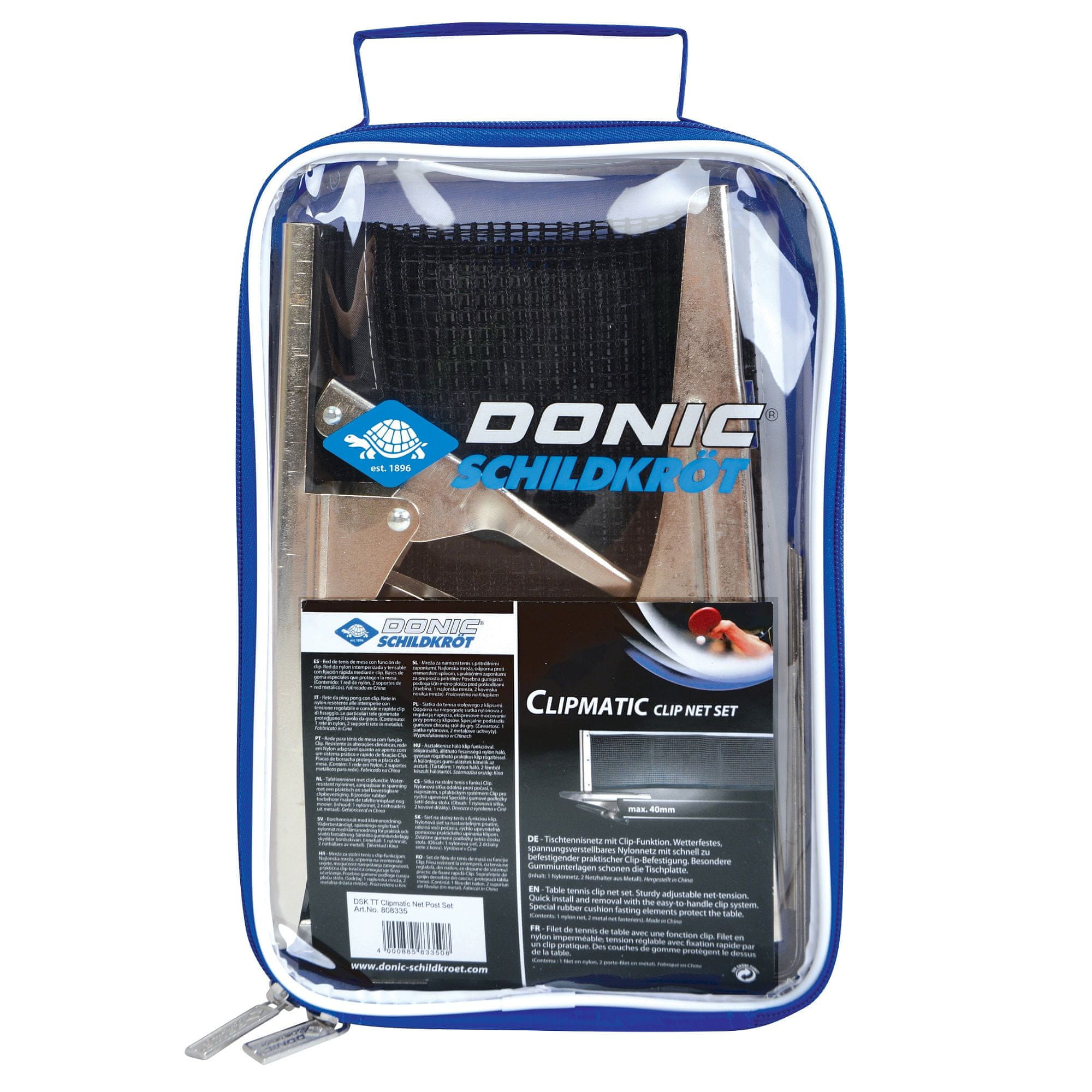 Mreža za namizni tenis DONIC Clipmatic je priljubljena mreža priznanega proizvajalca. Preprosta kovinska konstrukcija s praktično sponko ne zahteva zapletene montaže na mizno ploščo. Mreža je zasnovana za mize z debelino deske do 40 mm. V paketu je priložena najlonska mreža z nastavitvijo napetosti. Vse je pakirano v praktični vrečki z zadrgo in ročajem za nošenje.