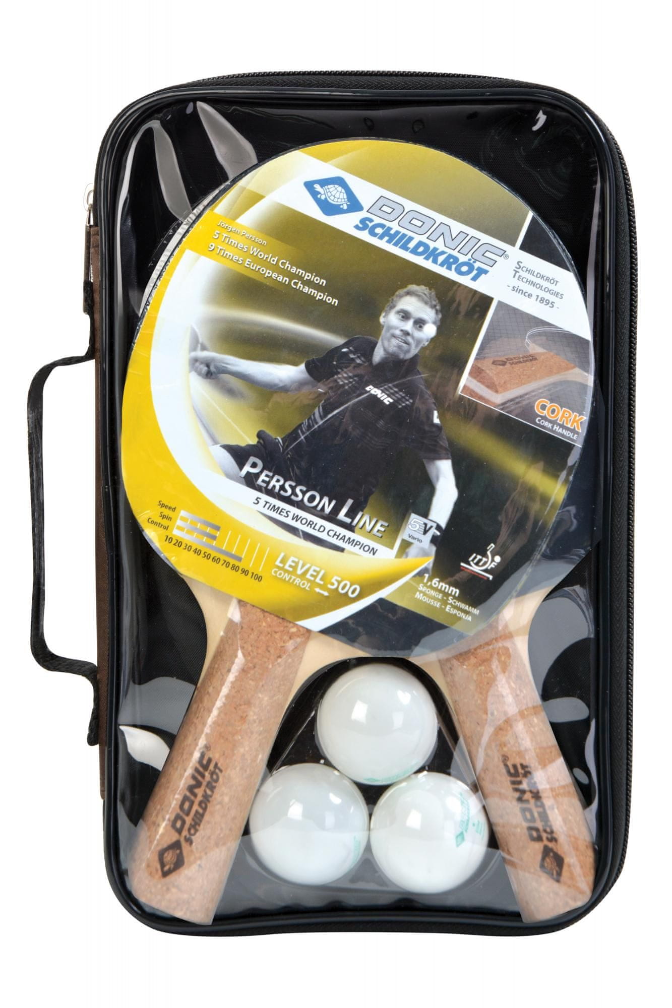 Donic-Schildkröt set za namizni tenis Top Persson 500 vsebuje 2 loparja in 3 žogice. Loparja linije Persson 500 sta primerna za napredne igralce. Ročaj loparjev je narejen iz plute, ki preprečuje prekomerno potenje. Set je pakiran v kakovostni torbici.