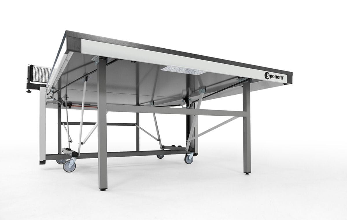 Tekmovalna miza Sponeta S7–62i je izdelana s tradicionalno skrbnostjo nemške blagovne znamke Sponeta in je zasnovana izključno za notranjo uporabo. Poleg visokokakovostne in dodatno ojačane igralne mize se lahko pohvali tudi z robustnim mehanizmom za zlaganje in ojačanim stabilizacijskim okvirjem na spodnji strani igralne mize.