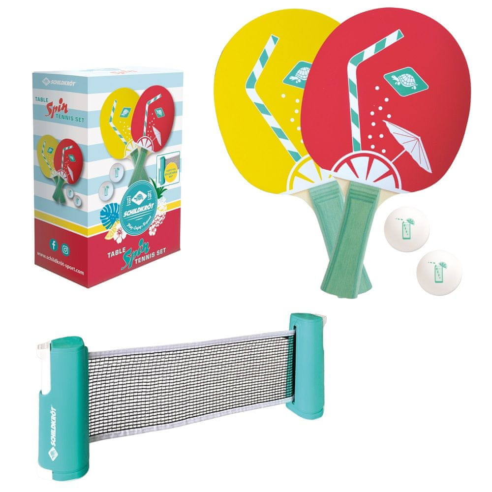 Z novim kompletom SCHILDKROT Spin Tropical ljubitelji namiznega tenisa ne potrebujejo več popolnoma opremljene mize za namizni tenis, temveč le preprosto stabilno mizo – tako lahko igro igrate kadar koli in (skoraj) kjer koli. Komplet vsebuje 2 rekreativna loparja, 2 žogici in, kar je najpomembneje, novo vrsto izvlečne mrežice za namizni tenis. Mrežo je mogoče preprosto namestiti na skoraj vsako mizo (debelina mizne plošče največ 4 cm, širina mizne plošče največ 170 cm) – draga miza za namizni tenis tako ni več nujno potrebna.