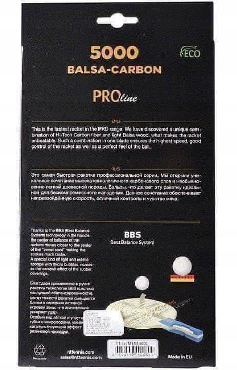 Palica za namizni tenis Atemi 5000 __HtM1P14CEhO1D3R___ je visokokakovosten izdelek, zasnovan za profesionalce. Ima 7-plastno konstrukcijo iz zelo lahkega, prožnega in proti deformacijam odpornega BALSA lesa, ojačanega z ogljikovimi vložki za večjo vzdržljivost in boljšo zmogljivost. Konstrukcija palice zagotavlja neverjetno hitrost in nadzor. Lopar Atemi 5000 ima sistem BBS (sistem najboljšega ravnovesja), ki zagotavlja popolno težišče in odličen občutek žogice. Lopar ima certifikat ITTF.