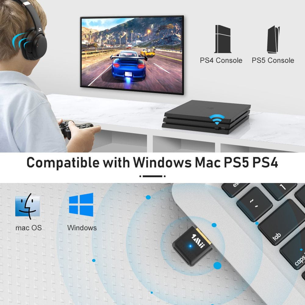 Naprava za povezovanje naprav AUDIO (samo) Bluetooth 5.0/ATS2831 z osebnim ali prenosnim računalnikom/PS4/PS5. Združljiva z A2DP/AVRCP/HFP/HSP/SBC/AAC. Napaja se iz vrat USB. Doseg do 20 metrov. Dvojna povezava