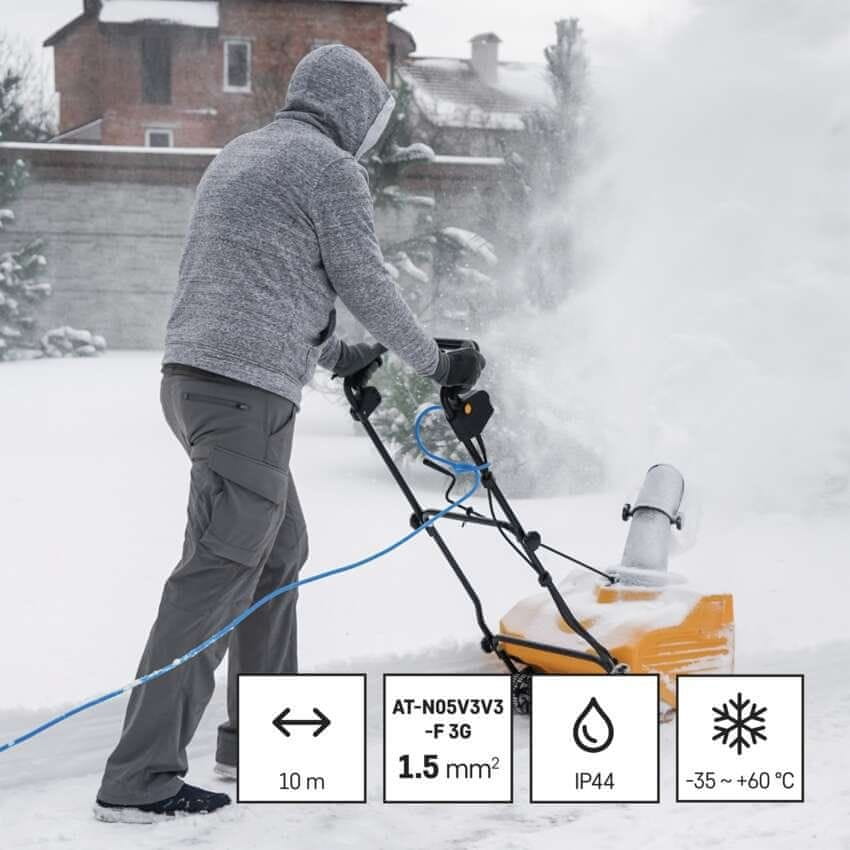 Modri PVC-kabel se v težkih razmerah obnese enako dobro kot gumijasti kabel. Vremensko odporni podaljški odporni na grobo ravnanje, hkrati pa ohranjajo veliko prožnost u lajšajo celotno ravnanje. V primerjavi z običajnim oranžnim PVC-kablom lahko vremensko odporen pri delu na prostem uporabljate zaradi njegove vodotesnosti z zaščito IP44. Zaradi značilne modre barve je kabel bolje viden v travi ali snegu, kar prispeva k večji varnosti pri delu.
