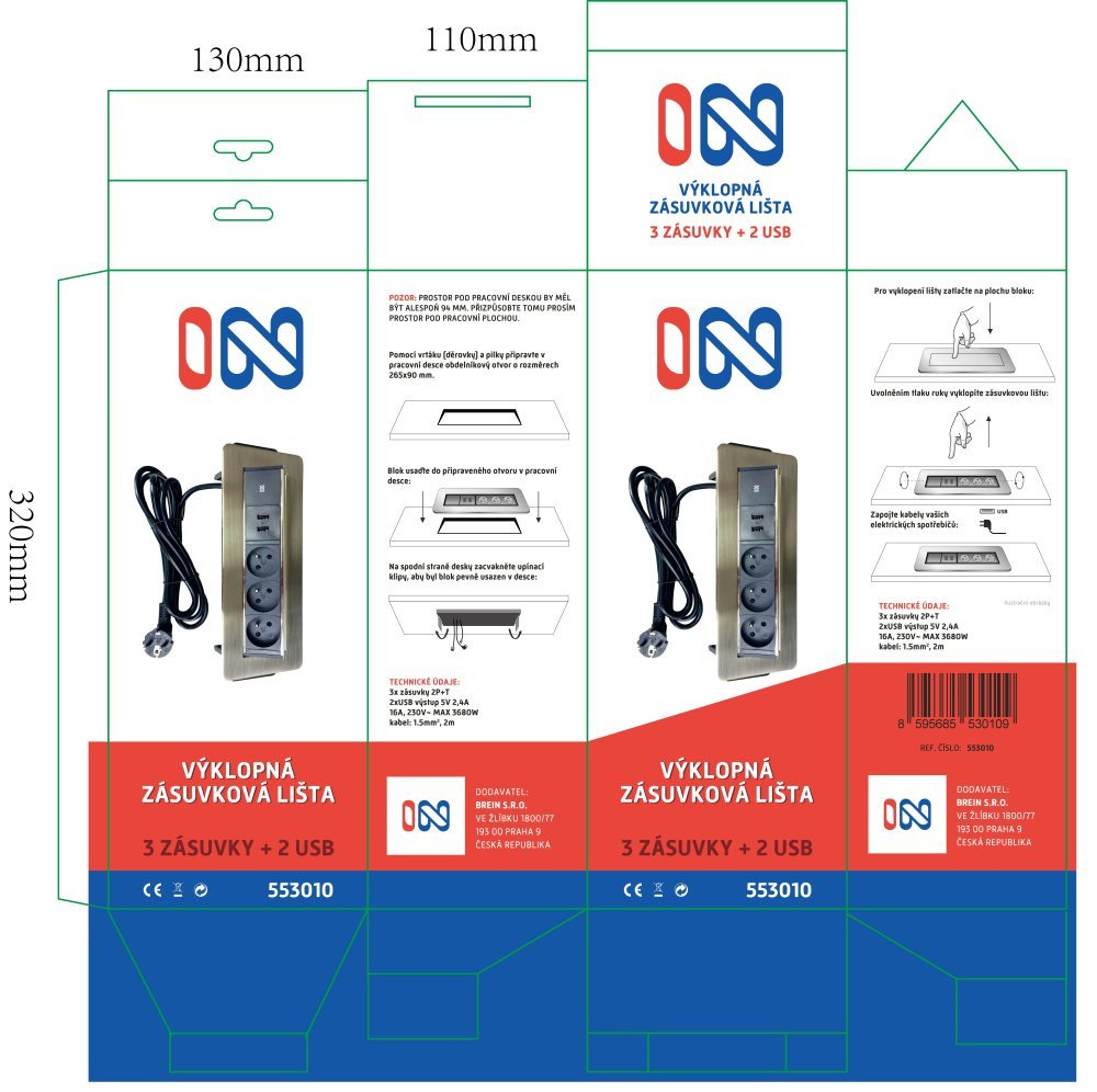 Primerna je povsod, kjer je treba skriti kable ter imeti hiter in priročen dostop do električnih vtičnic.Namestitev je preprosta, z žago izvrtajte luknjo velikosti 26,5 × 9 cm.Ta blok ima 3 vtičnice in 2 izhoda USB. Če pritisnete na sredino, se blok prevrne.Ohišje izdelka je izdelano iz trpežne plastike in poliranega jekla. Pokrov iz niklja.Napajalni kabel je dolg 2 m.Najmanjša priporočena globina vgradnje: 9,4 cm. Tehnične lastnosti: 3× vtičnice 2P+T, 2× izhod USB 5V 2,4A,16A, 230V~ MAX 3680W, kabel: 1,5mm2, 2m