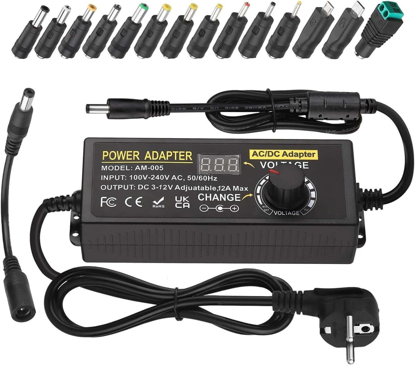 Nastavljiv napajalnik za široko uporabo. Vhod: AC 100–240V, izhodna napetost 3–12V DC, max. 12A, 144W. Vključuje 14 DC konektorjev in adapter za obratno polarnost. Združljiv z LED lučmi, zvočniki, usmerjevalniki, kamerami in še več. Vgrajena zaščita in LED prikaz.