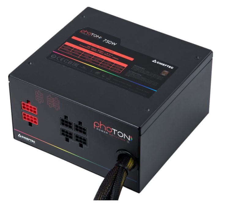 Modularni 750 W napajalnik CTG-750C-RGB serije Photon priznanega proizvajalca Chieftec se ponaša z visoko energijsko učinkovitostjo in zagotavlja stabilno ter zanesljivo napajanje vseh komponent v računalniku. Za hlajenje poskrbi tihi 120 milimetrski RGB ventilator, ki omogoča optimalno hlajenje pri nizkem hrupu. Vsebuje popoln nabor varnostnih funkcij, vključno z UVP, OVP, SCP, OPP, AFC ter SIP, ki zagotavljajo najvarnejše delovanje. Kabli s priključki so kakovostno izdelani. Poleg tega odvečne kable lahko zlahka odstranite in tako ohranite urejen videz.