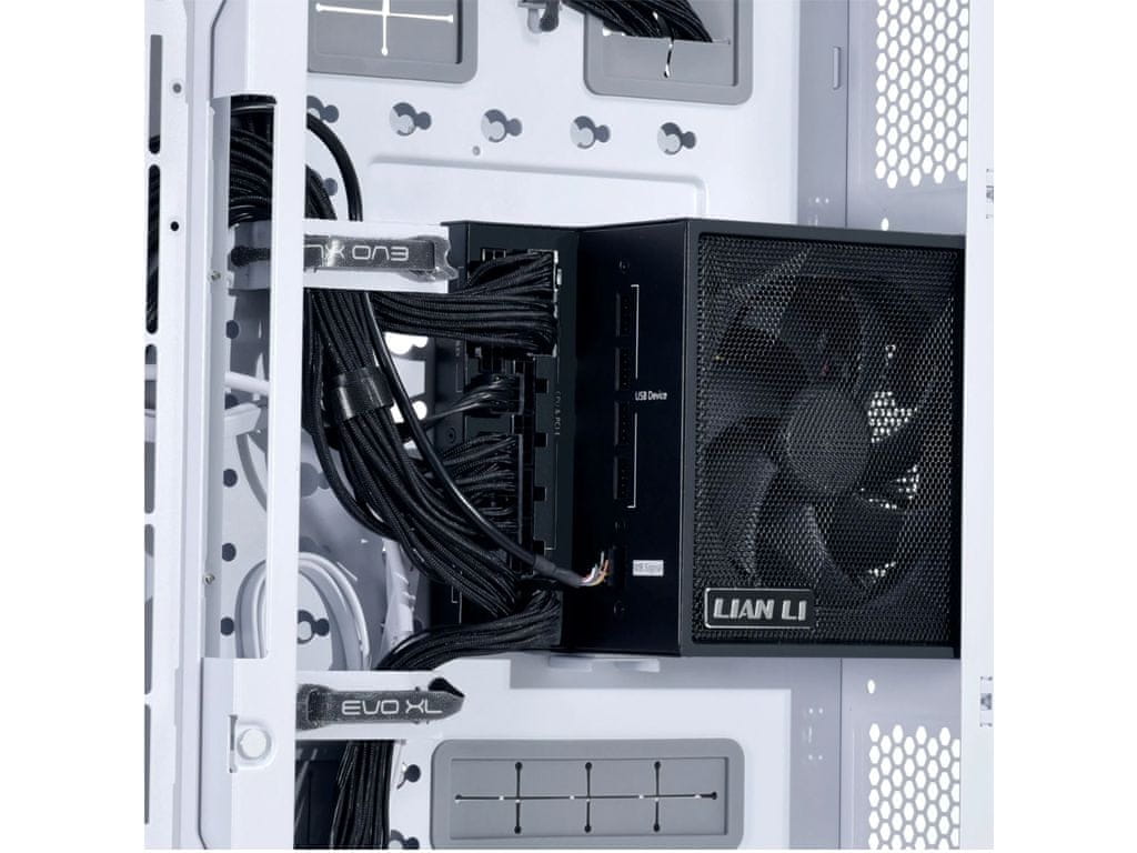 L-Oblika in Hub: Inovativna L-oblika zasnova poenostavlja namestitev in urejanje kablov v dvokomornih ohišjih. Vključuje vgrajen USB razširitveni hub s štirimi notranjimi glavami (9-pin konektorji) za dodatno povezljivost periferije in RGB krmilnikov.
