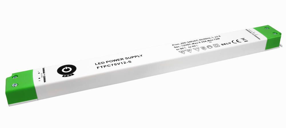 FTPC75V24-S: LED napajalnik 24V/3,125A CV, linearno plastično ohišje, 304,6×30×16,7mm Celoten opis