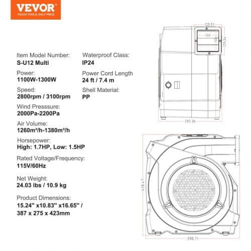 VEVOR Napihljiv ventilator S-U11 Multi 387x275x423 cm 1100W
