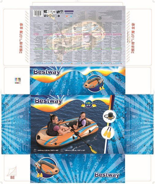 Bestway Condor Elite 2000. Napihljiv čoln je izdelan iz trpežnega vinila, ki je predhodno testiran. Zajemalna vrv po obodu čolna je pritrjena z vgrajenimi plastičnimi vponkami. Za lažji transport je na sprednjem delu čolna nameščen ročaj z vrvjo. Ob straneh čolna so vgrajene sponke za vesla, ki služijo tudi za pritrditev vesel. Konstrukcija s tremi komorami. Napihljivo dno za večje udobje. Težek ročaj. Medsebojno povezani ventili za hitro praznjenje. Varnostni ventil. Vključuje: 1 čoln, 1 par vesel, obliž za popravila. Zasnovan za 1 odraslo osebo in 1 otroka. Največja nosilnost: 120 kg. Velikost čolna po napolnitvi: 28 × 106 × 196 cm. 31 × 49,5 × 14,5 cm.