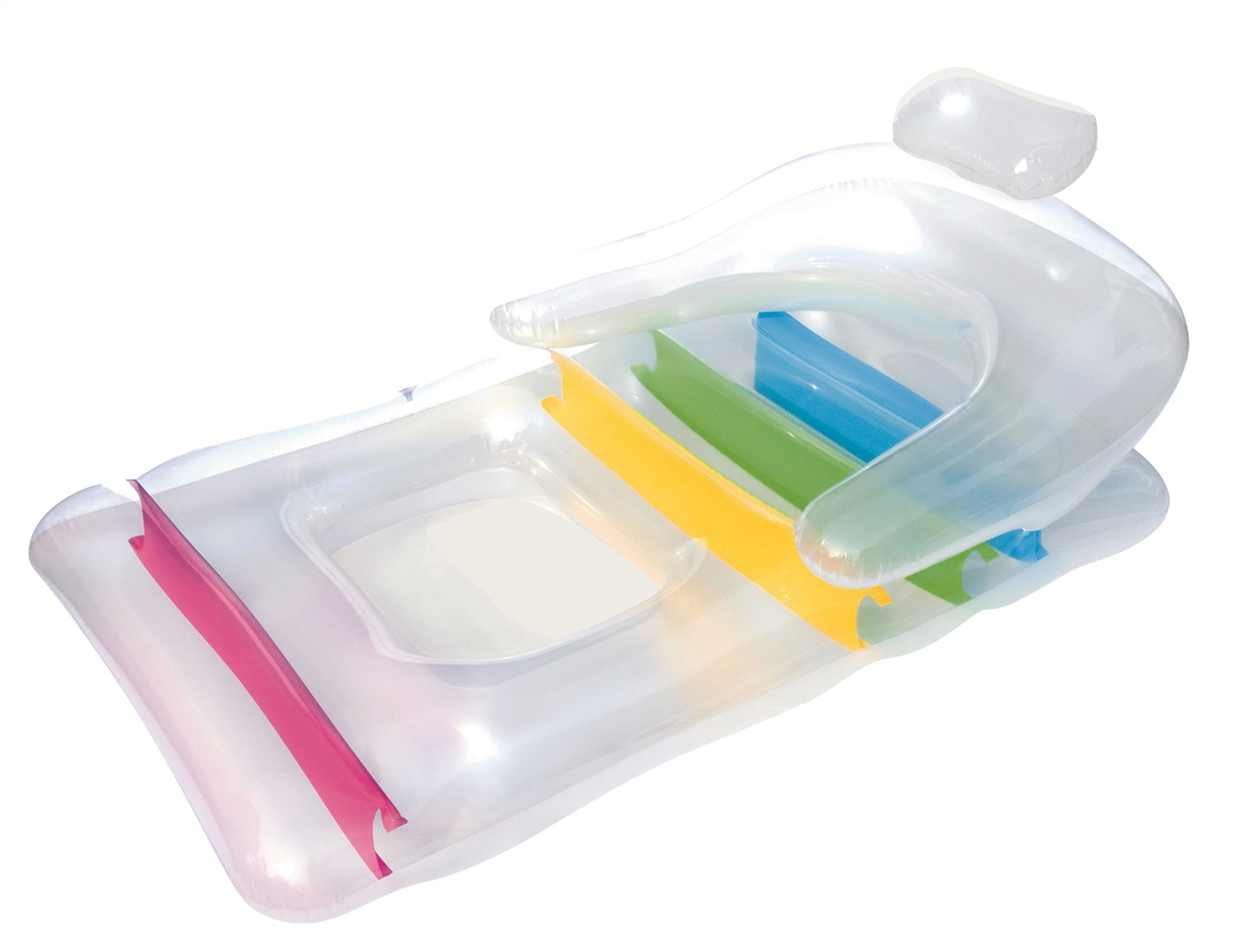 Napihljivi ležalnik KOOL LOUNGE je večnamenski stol s pogledom v vodo, ki zagotavlja izjemno udobje zaradi naslona za glavo, hrbta in komolcev. Ko je napihnjen, meri 165 × 89 cm in je opremljen z dvema napihljivima komorama. Njegova zasnova omogoča, da se iz ležalnika zloži v stol. Ležalnik ima nosilnost 90 kg in je izdelan iz vinila. Zasnova je prozorna z barvnimi ojačitvami v notranjosti ležalnika za estetski videz. Opozorilo: Pred uporabo je priporočljivo preveriti podlago, da na njej ni ostrih predmetov, kot so kamenčki ali vejice, ki bi lahko poškodovali ležalnik.