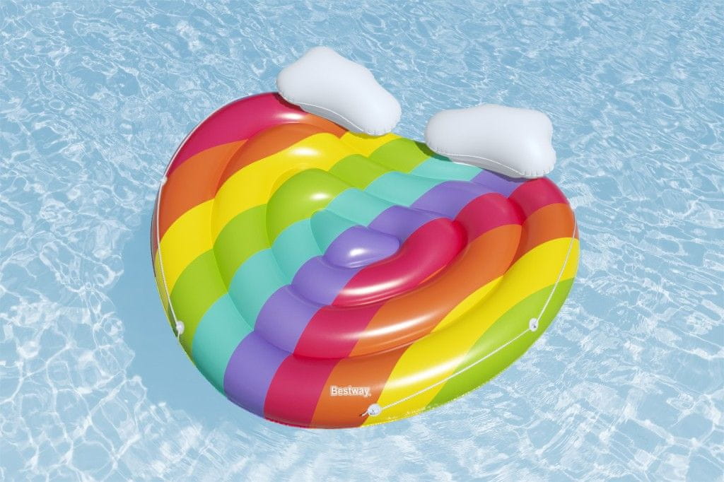 Napihljiv otok velikosti 1,75 m x 1,63 cm v mavričnih barvah in v obliki srca. Ležalnik je izdelan iz visokokakovostnega vinila, ima dve zračni komori in dve peresi za udobno sedenje. Priložen je obliž za popravilo. Največja dovoljena teža je 200 kg.