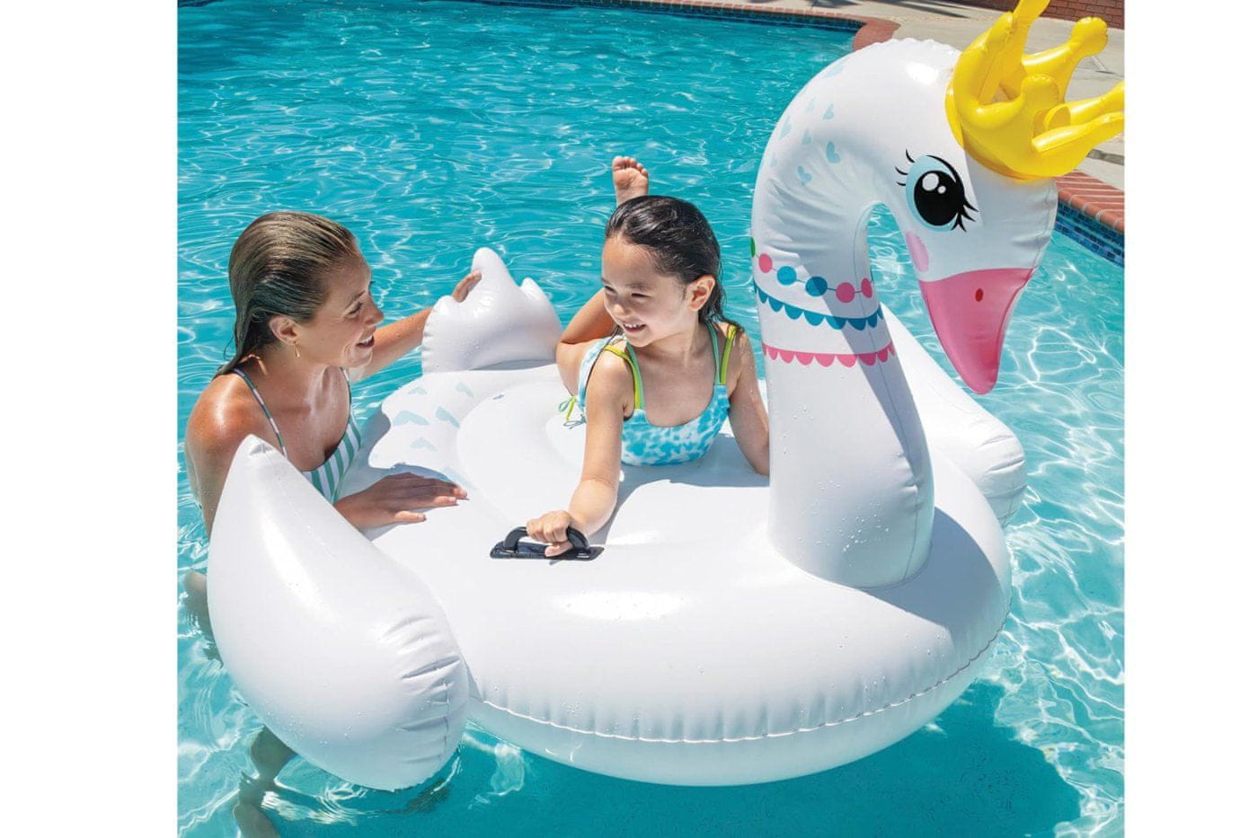 Napihljiv labod velikosti 142 × 137 × 99 cm. 2 ročaja na straneh. 2 zračni komori. Priložen je obliž za popravilo. Največja nosilnost je 40 kg.