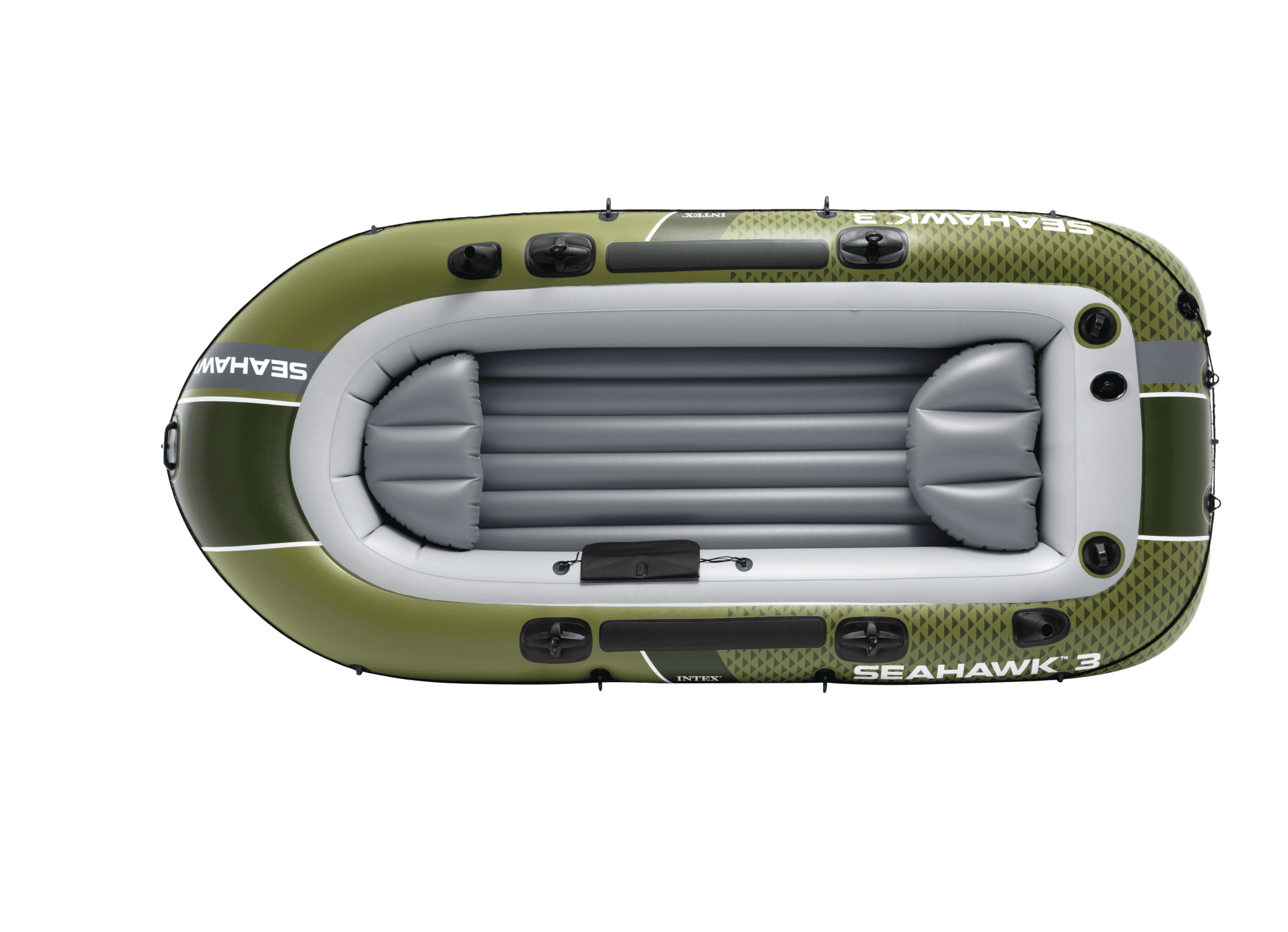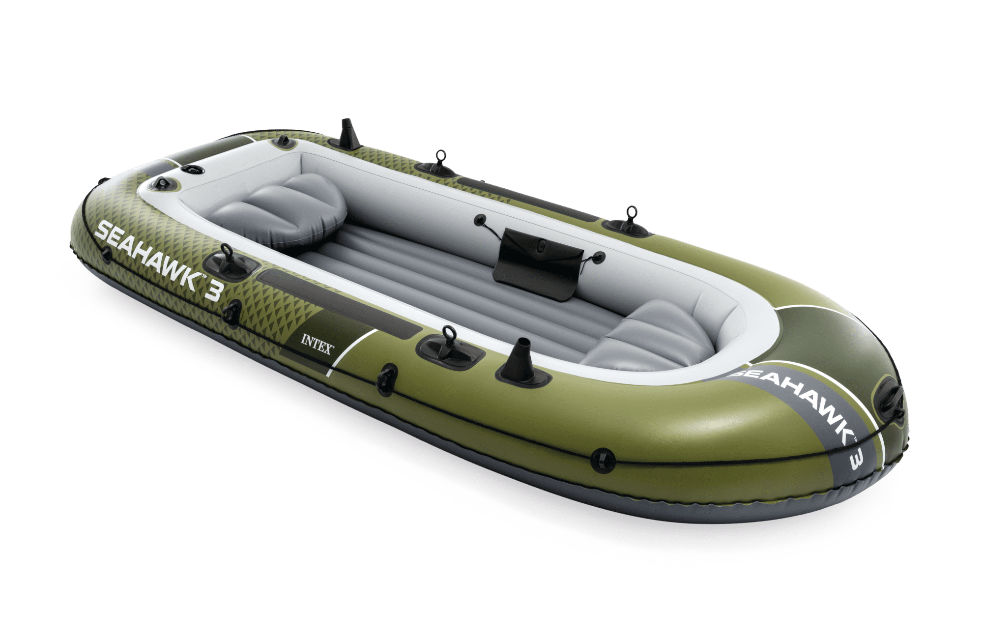 Napihljiv čoln Seahawk™ 3 je prostoren in vzdržljiv čoln za tri osebe, idealen za ribolov ali sproščujoče veslanje na jezerih, rekah in morju. Ponaša se s tremi zračnimi komorami, dvema napihljivima sedežema in dvema držaloma za ribiške palice. Set vključuje aluminijasta vesla in tlačilko. Celoten opis