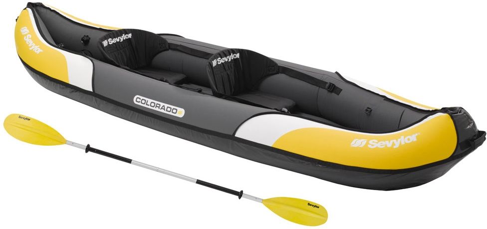 2 aluminijasti vesli, trdna PVC konstrukcija, vrv na stenah kajaka, 2 napihljiva, odstranljiva sedeža, 2 odstranljivi plavuti različnih velikosti, napihljivo, mehko dno, ročna tlačilka Air Hammer™, priložena krpa za popravilo.