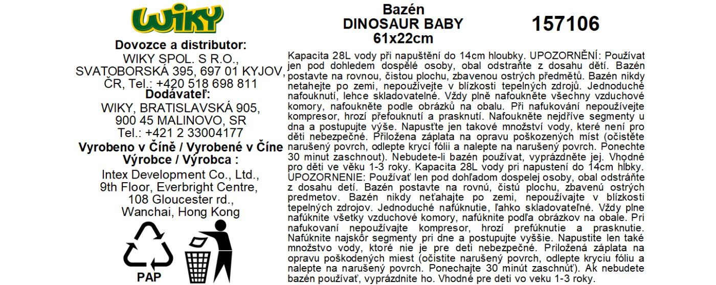 Detski napihljivi bazen. Bazen ima tri komore. Napihljiv bazen lahko zelo enostavno napihnete in ga postavite skoraj kamor koli. Prostornina za vodo (28 l) do višine stene 14 cm. Dimenzije 61 × 22 cm. Primeren od 1 do 3 let.