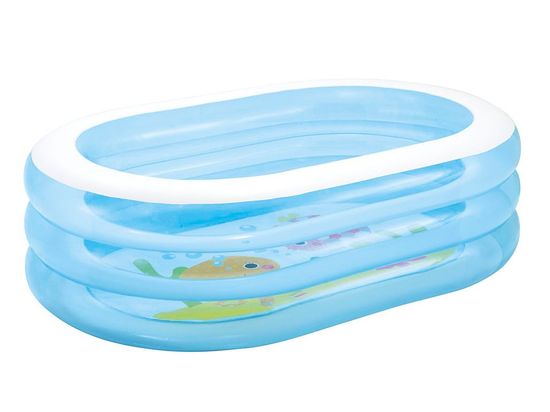 Opis predmeta: Ta ovalni, napihljiv vrtni bazen Intex je zasnovan za najmlajše ljubitelje poletne zabave. Bazen ima visoke napihljive stene, sestavljene iz treh prozornih obročev. Večbarvno dno s pravljičnimi motivi in