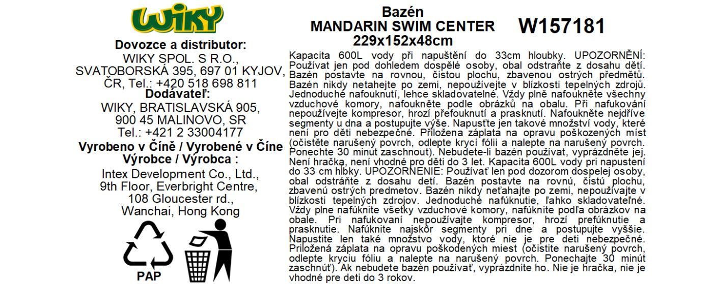 Družinski bazen, velikost: 229 × 147 × 46 cm, prostornina 600 l, višina stene 33 cm, izpustni ventil, 2 zračni komori, material: vinil 0,33 mm, komplet za popravilo
