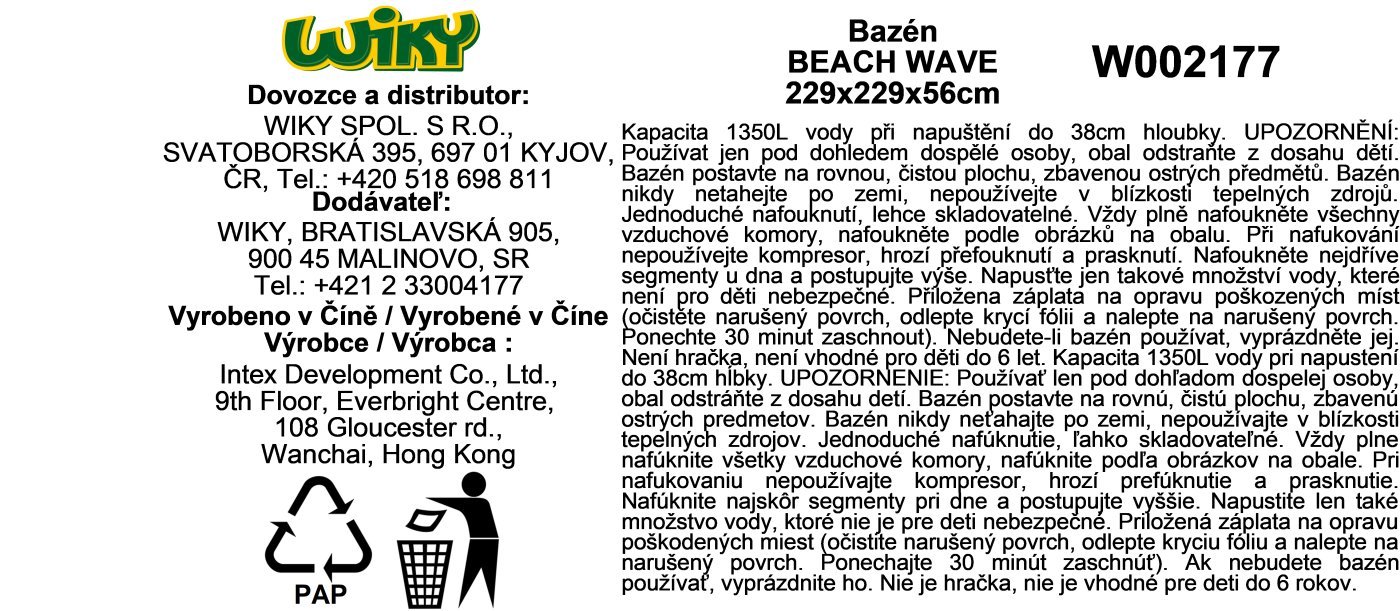 Napihljiv bazen, velikost: 229 × 229 × 56 cm, prostornina: 1250 l pri nivoju vode 33 cm, vinil 0,33 mm, 3 napihljive komore, izpustni ventil, komplet za popravilo