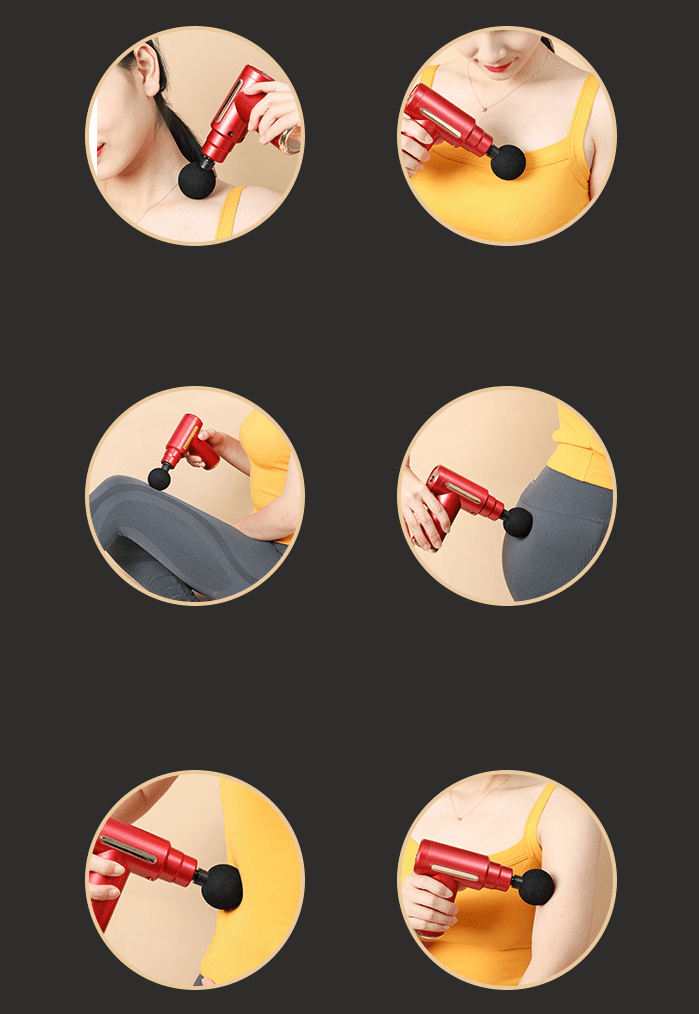 Praktična masažna pištola Tavalax s štirimi različnimi nastavki za različne skupine mišic in 6 načini delovanja . Priložen praktičen kovček za shranjevanje.