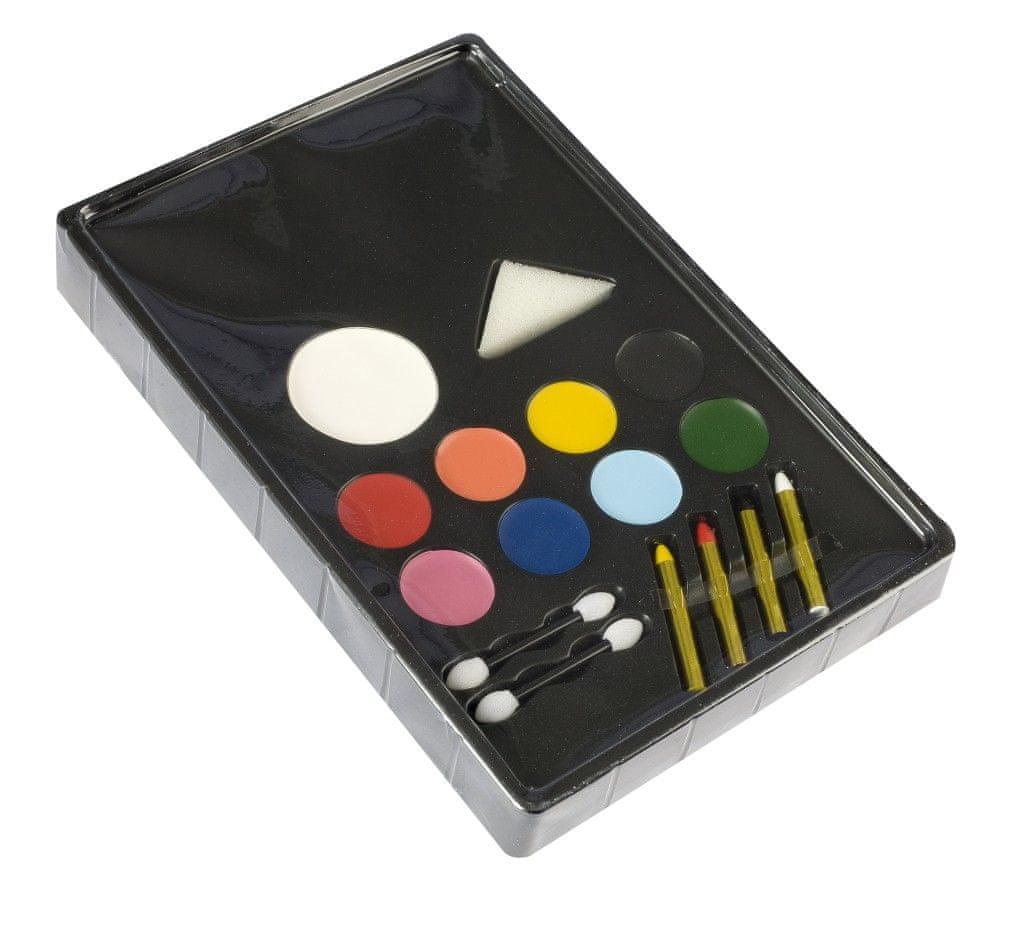 Komplet za barvanje obraza vsebuje 8 barv za obraz, 4 barvne svinčnike, gobico in 2 kozmetična čopiča. Celoten opis