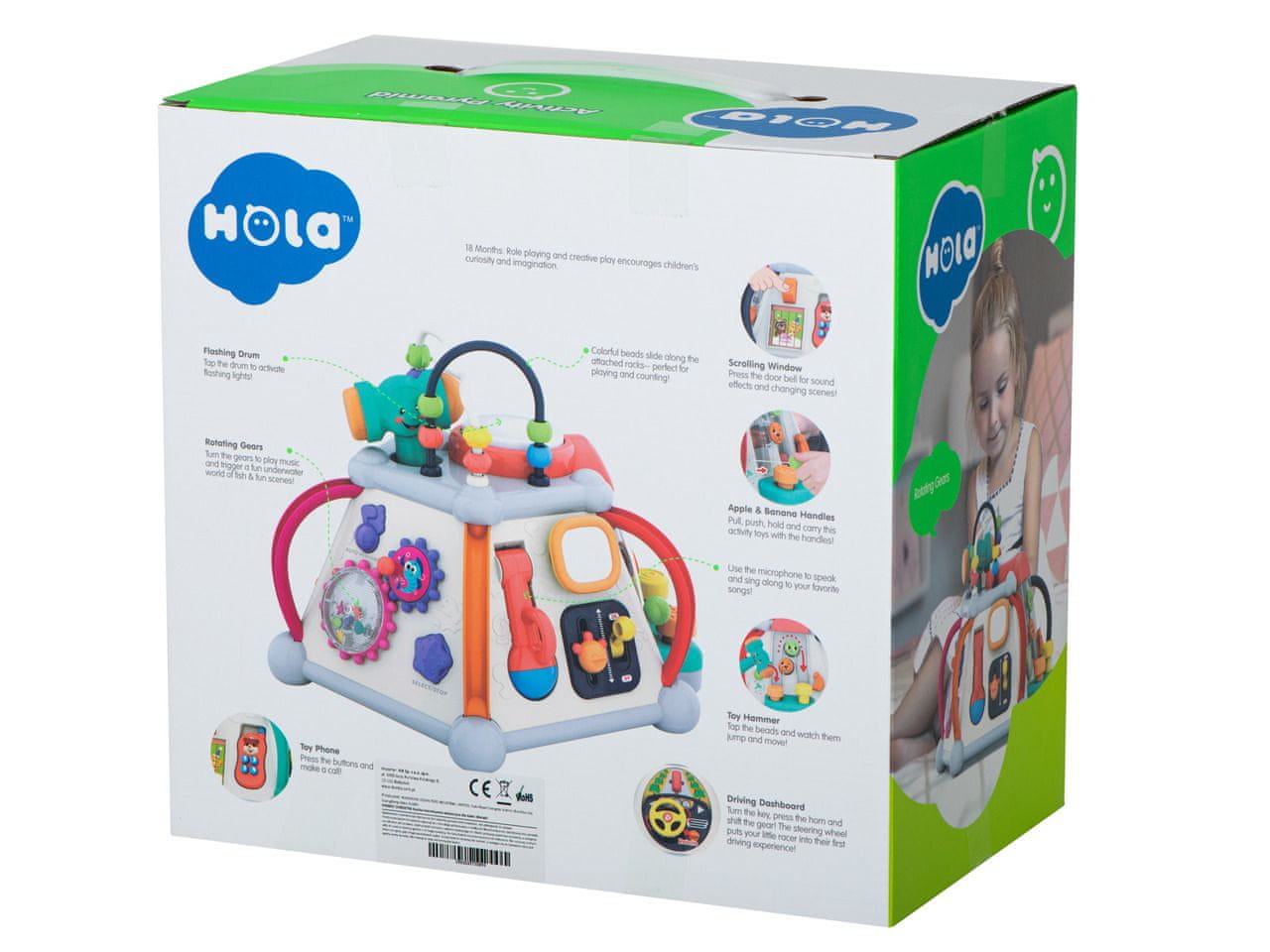 IZOBRAŽEVALNA INTERAKTIVNA KOCKA Večnamenska interaktivna kocka za najmlajše bo pripomogla k pravilnemu razvoju vašega otroka. Raznolikost oblik zabave bo poskrbela, da bo vsak našel nekaj zase. Kocka je sestavljena iz 5 ploskev. Vsaka stena je opremljena z različnimi atrakcijami. Wall 1 Arkadna igra s kladivom. Če želite poskusiti vreči žogo na drugo stran tunela, morate pritisniti enega od dveh gumbov. Zaslišal se bo zvok in zgornji boben bo zasvetil. Na steni sta tudi 2 gibljiva elementa na samonavijalni vrvici. Wall 2 ima mikrofon, ki resnično deluje. Ta ima stikalo za vklop/izklop mikrofona in nadzor glasnosti. Poleg tega je tu še osvetljeno ogledalo, ki se s pomočjo stikala spremeni v TV s sliko. Wall 3 Zasnovan za male avtomobilske navdušence. Ima volan s hupo in vrtljiv ključ. Wall 4 bo všeč vsem otrokom, ki obožujejo telefon. Stena je opremljena s snemljivim telefonom s škripajočimi cevmi. Poleg tega je bilo nameščeno okno s spreminjajočimi se stenami in melodijami, ki ustrezajo sliki. Prizore spreminjate z oranžnim gumbom. Stena 5 Na njej so zobniki, eden od njih je napolnjen s tekočino, v kateri so potopljene barvne figure. Vrtenje zobnikov povzroči zvok. Poleg tega je na tej steni gumb za izbiro/zaustavitev, motorna zanka s pisanimi perlicami za gibanje, boben in kladivo. Lahko ste prepričani, da vas bo igrača zabavala več ur. Interaktivna kocka je zasnovana tako, da je odlična zabava v kombinaciji s podporo pravilnemu razvoju otroka, pri čemer bo malček razvijal logično razmišljanje in ročne spretnosti prstkov. Kocka bo odlično darilo za malega raziskovalca. Kocka bo odlično darilo za malega raziskovalca. Material: Plastika Napajanje: 3 × 1,5 V AA baterije (niso priložene) Mere kocke (dolžina ene stene x višina): 30 cm x 27 cm Dimenzije paketa: 30 cm x 28,5 cm x 18 cm