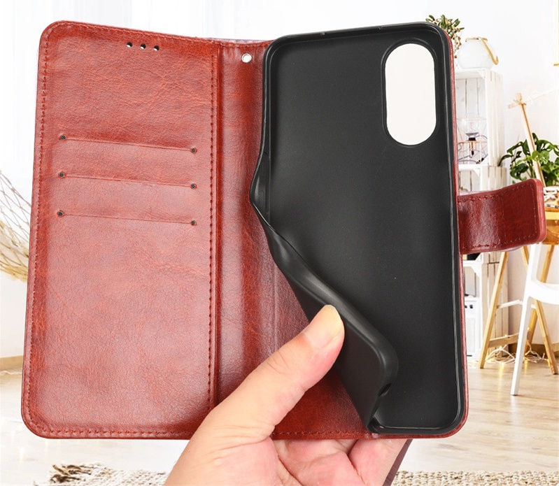 Kovinska usnjena torbica za Oppo Reno 11F rjava Celoten opis