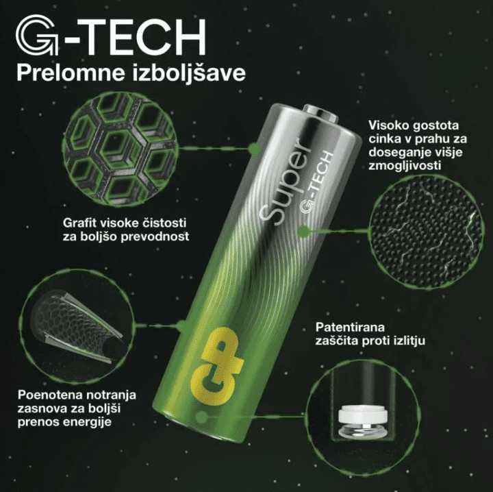 Napredna tehnologija G-TECH vključuje cink visoke gostote in izboljšano prevodnost, kar omogoča stabilno oskrbo z energijo tudi pri večjih obremenitvah. Poleg tega imajo baterije dodano zaščito pred iztekanjem, kar zagotavlja varno uporabo in varuje vaše naprave pred poškodbami, ki jih lahko povzročijo iztekle baterije. Zasnovane so tako, da nudijo zanesljivo delovanje tudi pri različnih temperaturah, zato jih lahko uporabljate doma, na prostem ali celo na potovanjih.